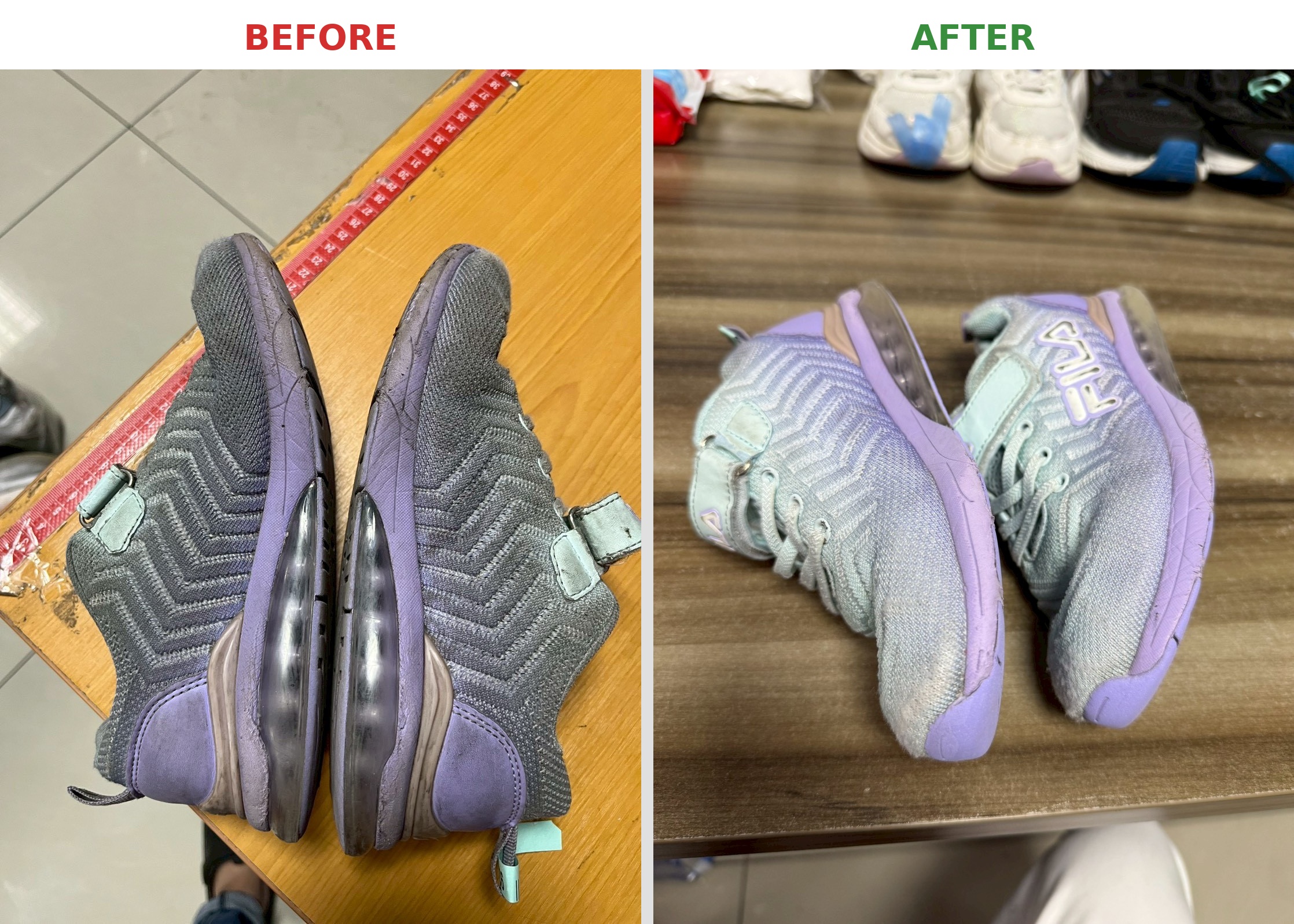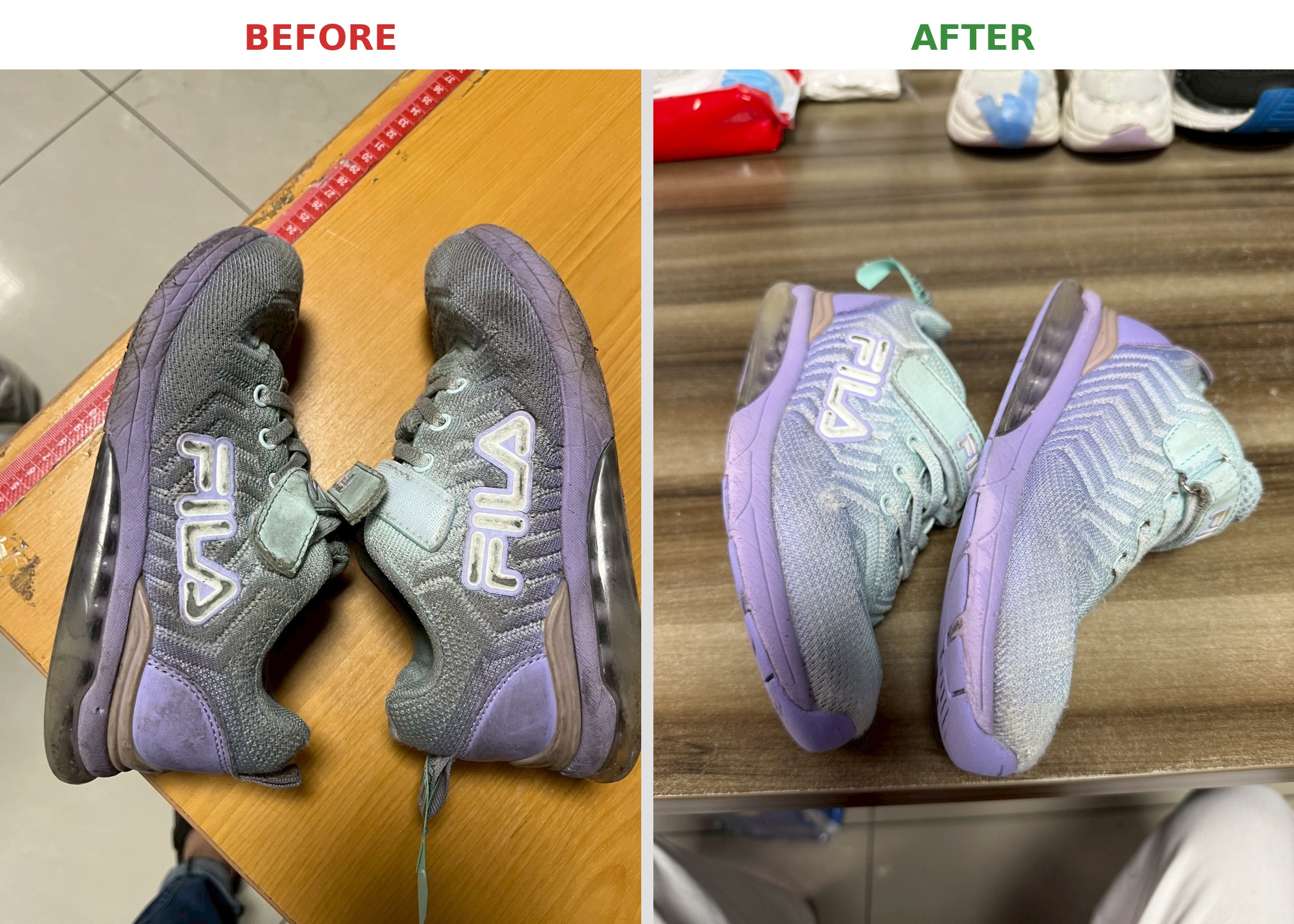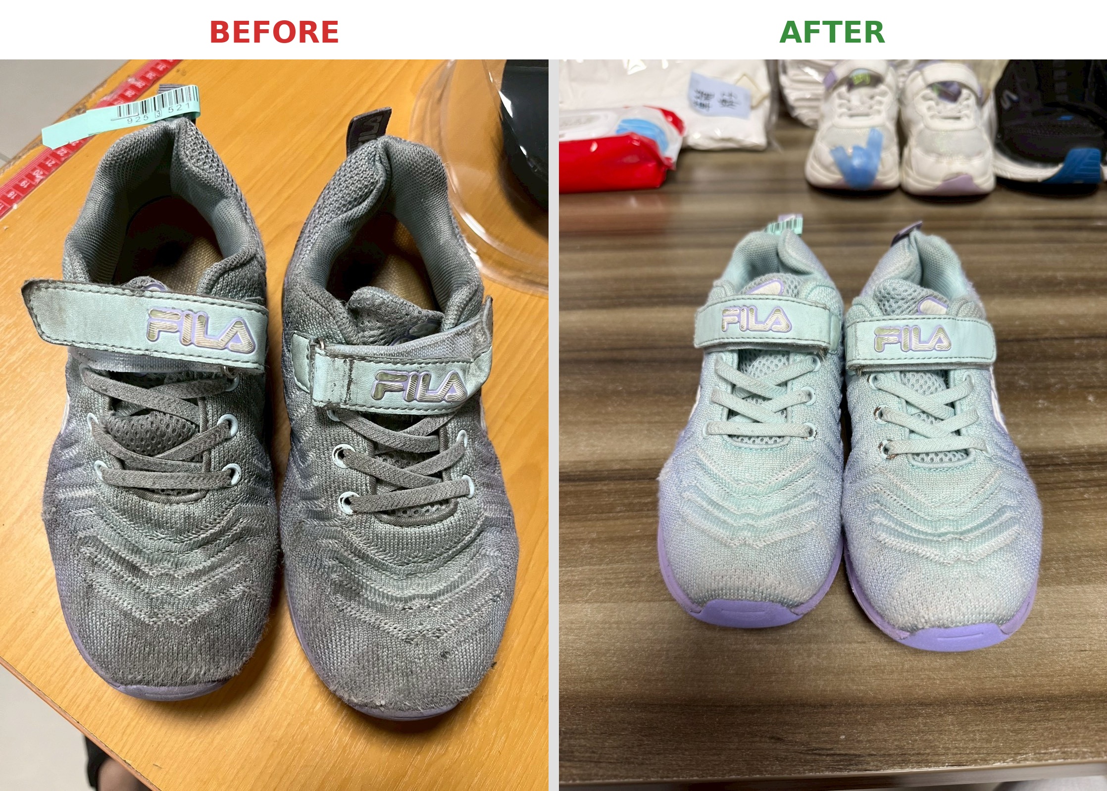 Children's shoes typically look like this—so parents dropping them off for cleaning, don't worry or feel embarrassed!