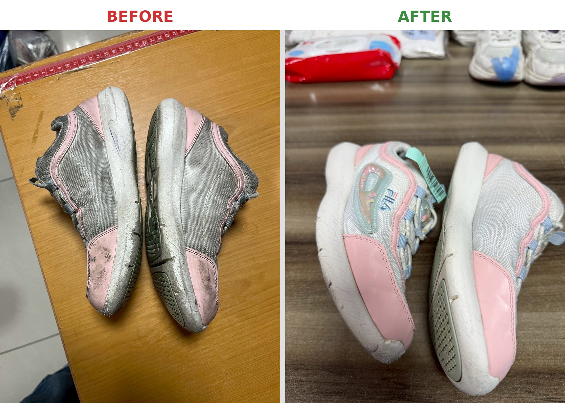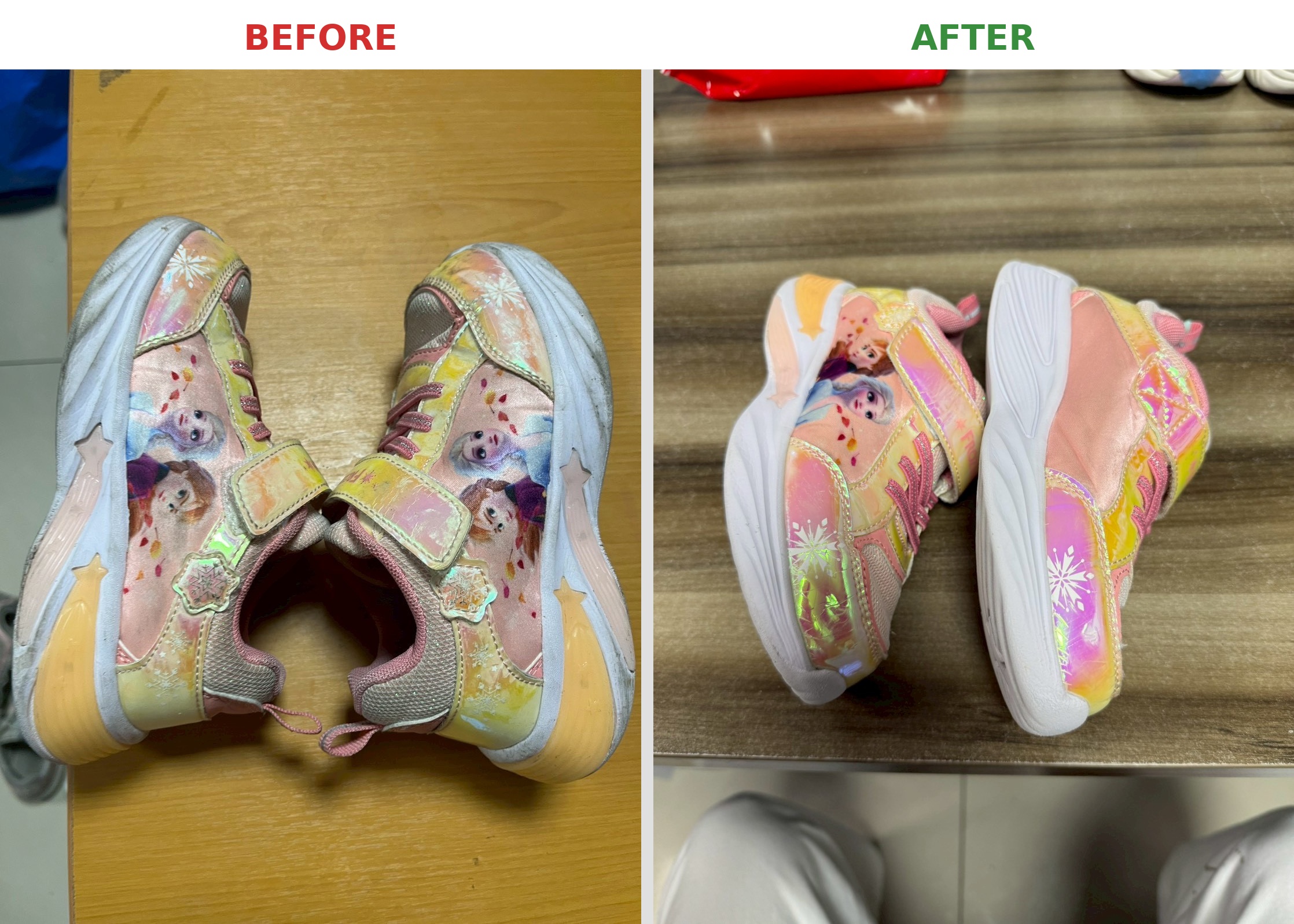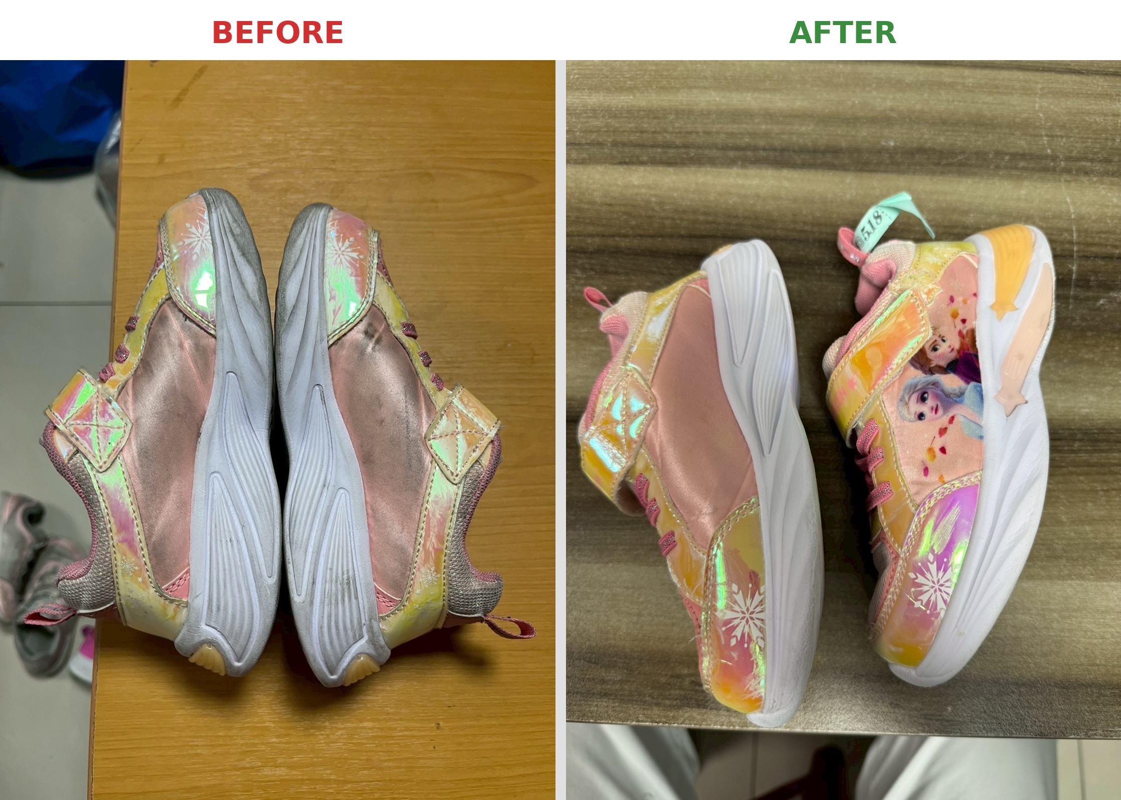 The photos show the shoes right after our first cleaning. We typically conduct a second inspection before final delivery. For instance, there's still some black residue on the front of the patterned shoe in the image, which we would further treat.
