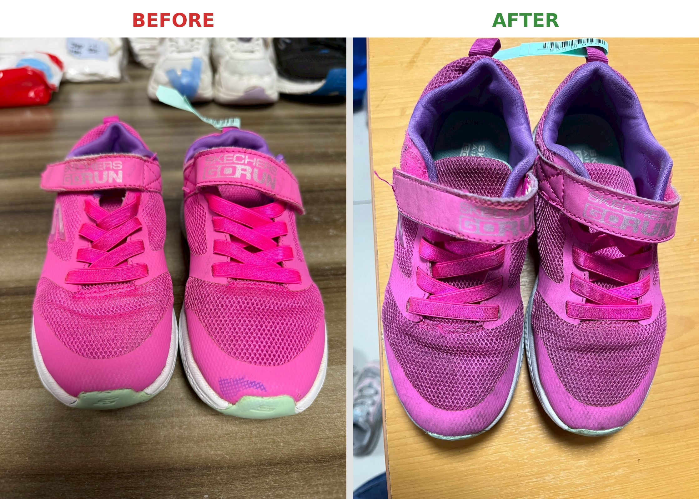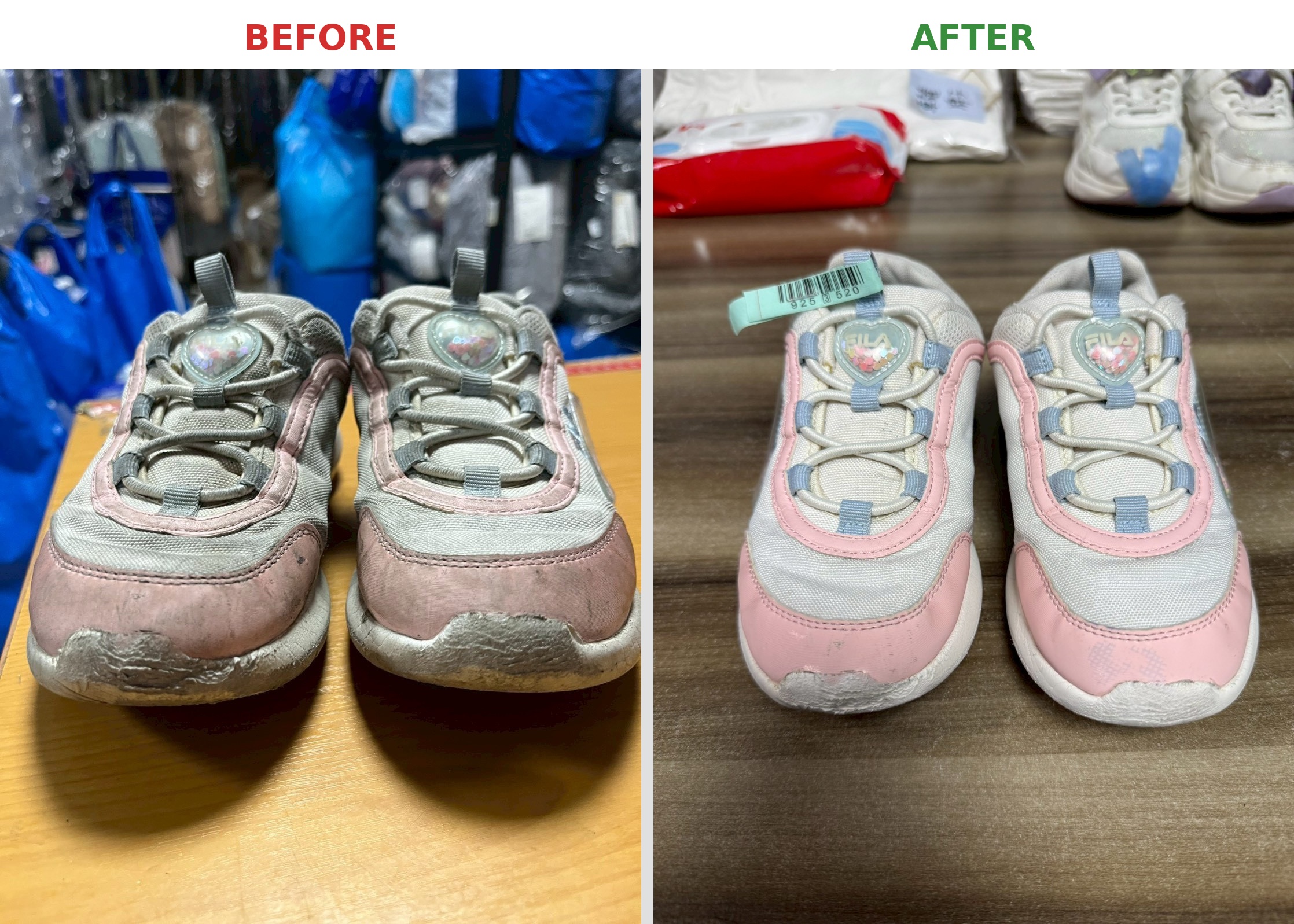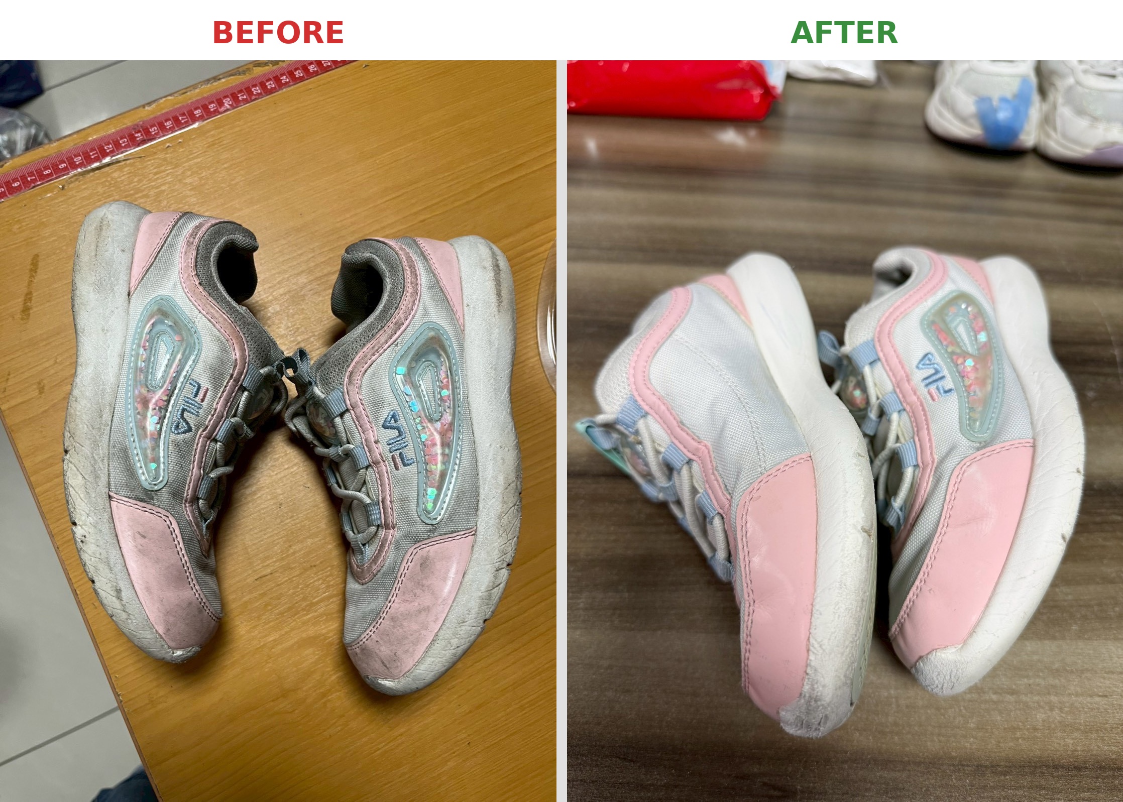 The photos show the shoes right after our first cleaning. We typically conduct a second inspection before final delivery. For instance, there's still some black residue on the front of the patterned shoe in the image, which we would further treat.