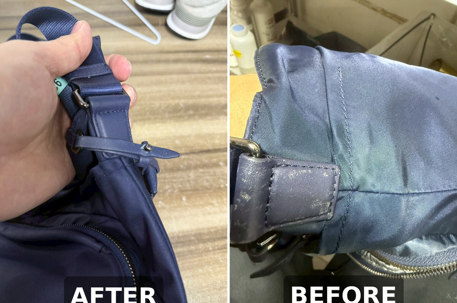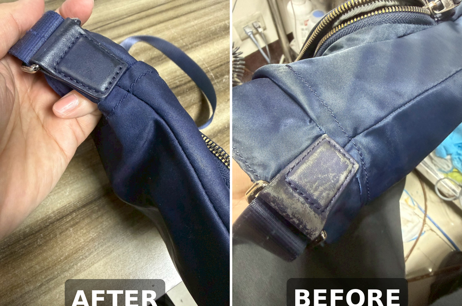 When I first received it, I cleaned it and tried treating the yellow stains. However, I discovered the yellowing remained the same, confirming it was actual fading rather than just stains. I also noticed serious wear on the leather seams, so I decided to address both issues at once. Finally, based on the color of the interior lining, I did my best to restore the color as much as possible. Now it can be used for quite a while longer!